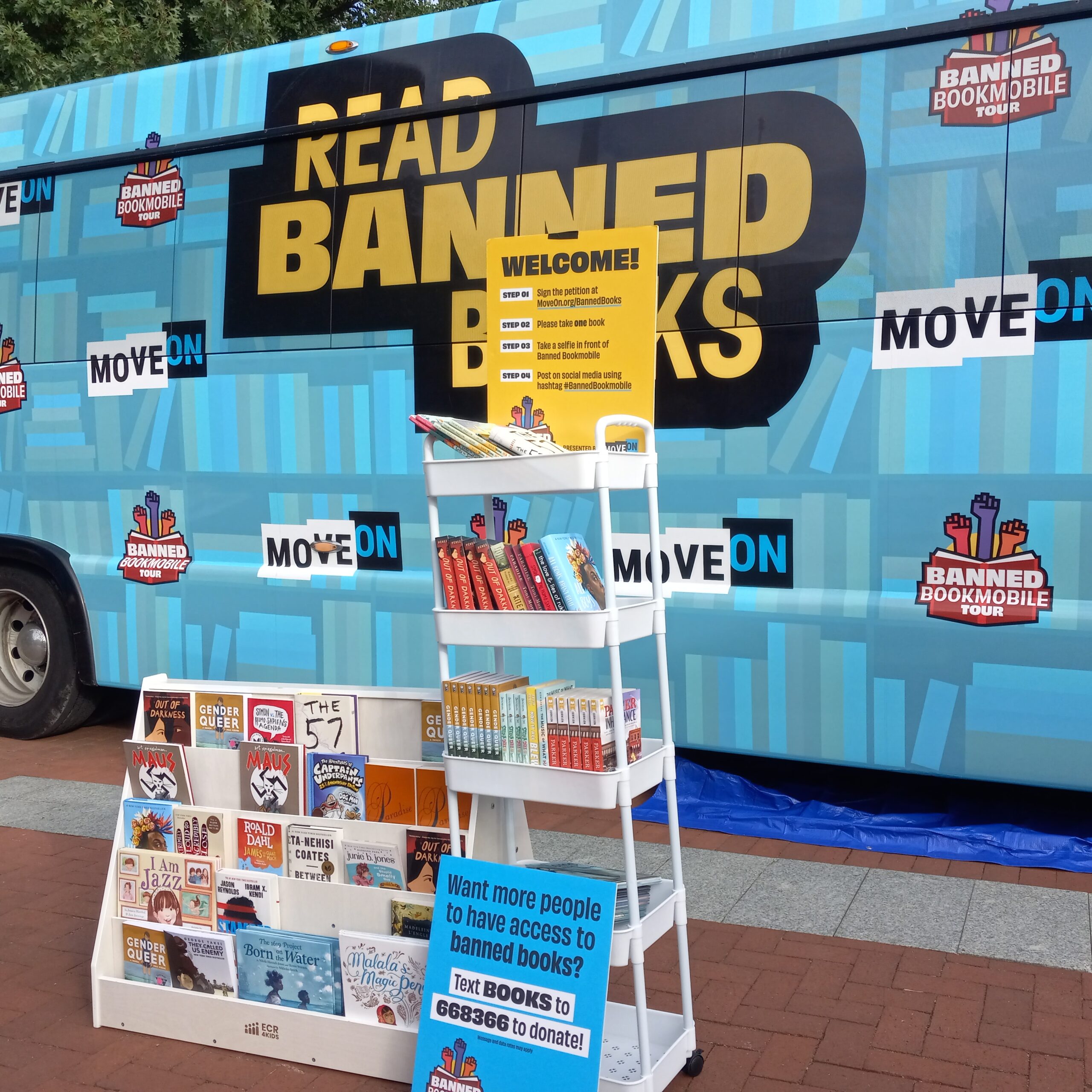 MoveOn distributed free copies of more than 40 of the most frequently banned books along the tour, including titles banned in certain Virginia districts, such as “The Bluest Eye” and “The Perks of Being a Wallflower.”